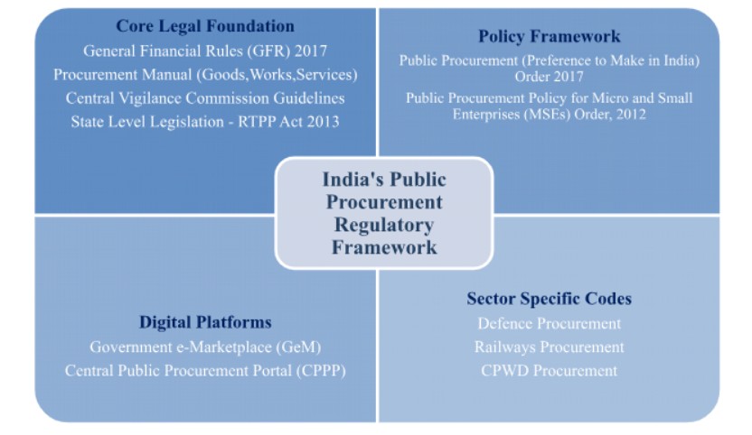 (c) Regulatory Framework in India for Public Procurement: India’s public procurement framework is anchored in the General Financial Rules (GFR), 2017 and supported by detailed Procurement Manuals for goods, works, and services along with Central Vigilance Commission (CVC) guidelines. Policies like the Public Procurement (Preference to Make in India) Order 2017, and the Public Procurement Policy for Micro and Small Enterprises (MSEs) Order, 2012 promote domestic industry and small enterprises. Several sectors (e.g.- Defence, Railways, Central Public Works Department (CPWD)) follow their own procurement codes, while states such as Rajasthan have enacted laws like the Rajasthan Transparency in Public Procurement (RTPP) Act, 2012. Digital platforms—Government e-Marketplace (GeM) and the Central Public Procurement Portal (CPPP)—have further strengthened transparency and efficiency.