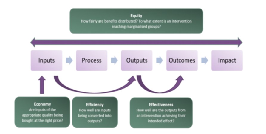 The term is now used widely by development actors such as International NGO umbrella networks, institutional donors, and multinational organisations such as the Development Assistance Committee (DAC). VfM is often expressed through three different criteria – Economy, Efficiency, and Effectiveness. UK agencies have recently addeda significant fourth ‘E’ – Equity – which refers to the fair allocation of benefits. Frequently, these criteria serve as principles that inform the decision-making of funders. It is now common VfM practice to map the 4E framework against a standard results chain(Vera Scholz;2020). (see diagram below, based on DFID (2011)).