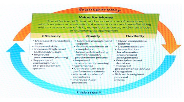 procurement reforms intend to ensure VFM by improving flexibility, quality, and efficiency throughout the procurement cycle (see illustration below). VFM is part of a holistic procurement structure with three support pillars: efficiency, quality, and flexibility. The two key principles of transparency and fairness weave across all elements of the structure.